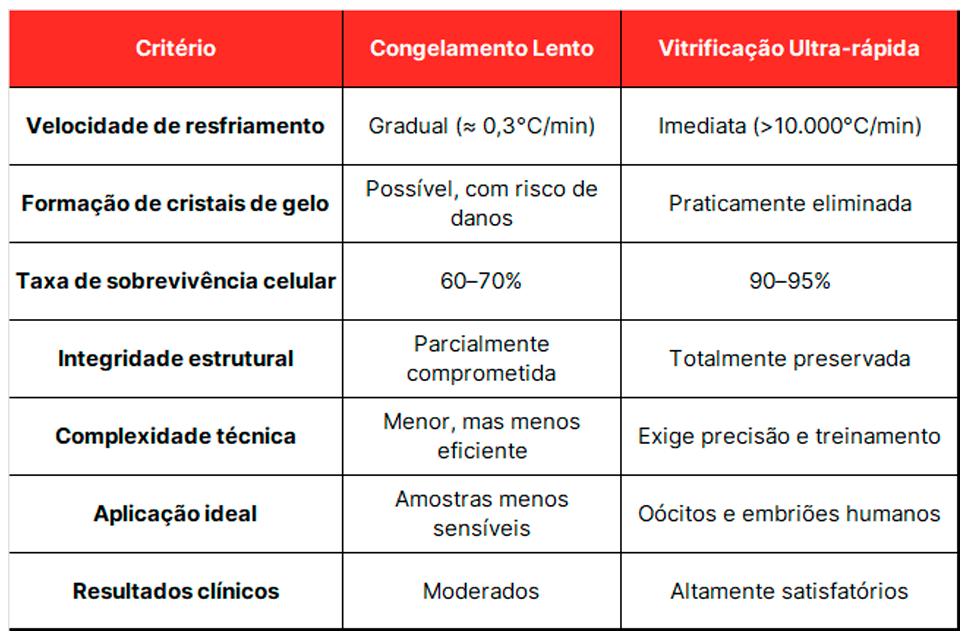 Enquanto o congelamento lento representou um passo fundamental, a vitrificação ultra-rápida se consolidou como a técnica mais segura e eficiente, com resultados superiores em preservação celular e sucesso reprodutivo.